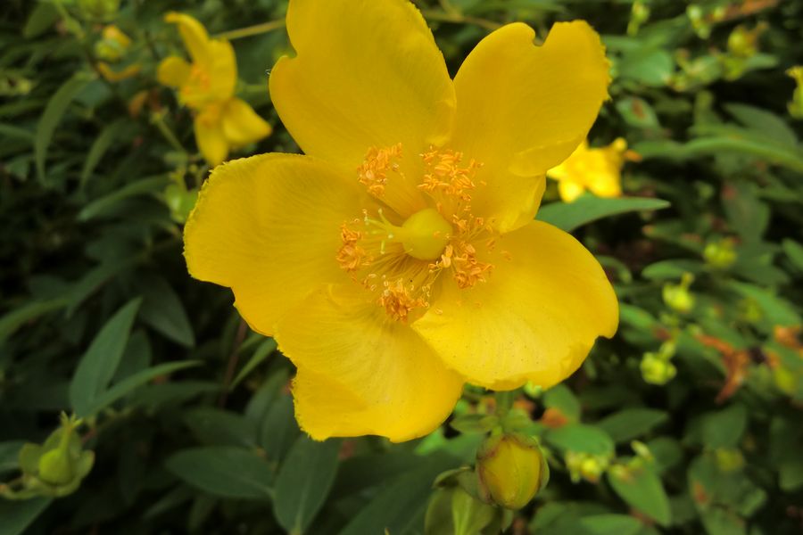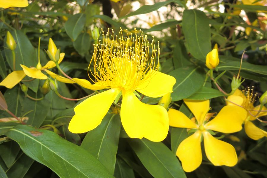 現在では改良した「ヒドコート(通称キンシバイ)」という、花が大きく、多数の花を付ける園芸種が主流となっており、我がハイツでもほとんどがこのヒドコートです。俣野公園内で咲いているものも多くは本種です。ビヨウヤナギも一画にあります。 ビヨウヤナギも以前はよく目にしたと思っていましたが、今では10株ほどが見られる程度です。 強い日差しのなかで黄色の花が目立っています。 6月~9月と花期も長くハイツでもあちこちで風に揺れています。