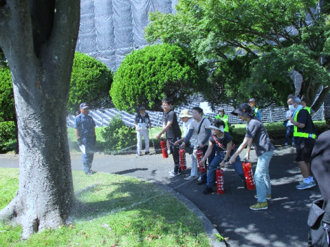 火器による消火訓練(左下写真)、スマホを使ったLIVE