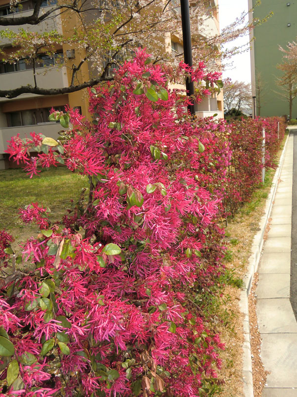 トキワマンサク (常盤万作・常緑中木) 花トキワとは常盤=葉が一年中緑色の意味です。 トキワマンサクの白花は日本でも自生種がありますが、赤花種は中国から1960年代に輸入され急に人気が出てきました。ガーデニングブームもあり、現在では花や葉の色の組み合せで多数の品種が出ています。ハイツでは構内改修時に目隠し用生垣として植栽され、今年はとても華やかに咲いています。 白花トキワマンサク=10号棟南側、20号棟北側、管理棟前・ハイツバス停横など 赤花トキワマンサク=管理棟と12号棟の間通路、19号棟北側 その他の場所にもあるかも知れません。