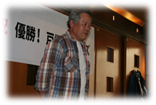 優勝旗及び優勝カップ、また店のサービスで用意して頂いた横断幕を前に楽しい時間を過ごすことができました。