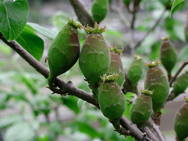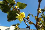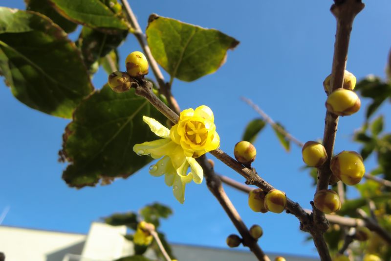 ソシンロウバイ (素心蝋梅 落葉低木)冬空にとても見栄えのする花です。 花の様子が蝋細工のような梅に似ることから、この名が付きました。江戸時代初期に、園芸用として渡来した。「蝋梅」という中国名が音読みされ、そのまま和名になりました。「ロウバイ」と一括りしていますがハイツのものは全てソシンロウバイです。花が多く、人気の品種です。 蝋細工の様な半透明の花は香りと相まって人気の花木です。また花持ちが良く枝ぶりが好まれて、正月を飾る生け花用花材としても欠かせません。そして唐突ですが、私はこの花を見るとなぜか、必ず、野菜の「ミョウガ」の花がダブります。なぜだろう・・? この時期、すっかり葉を落とした木に花を付け、良い香りを漂わせます。 が・・今年は開花しながらも、まだ葉を付けている状態です。例年とは少し姿が違うようです。そして初夏に見られる、ユニークな形の「実」も是非覚えておいてください。
