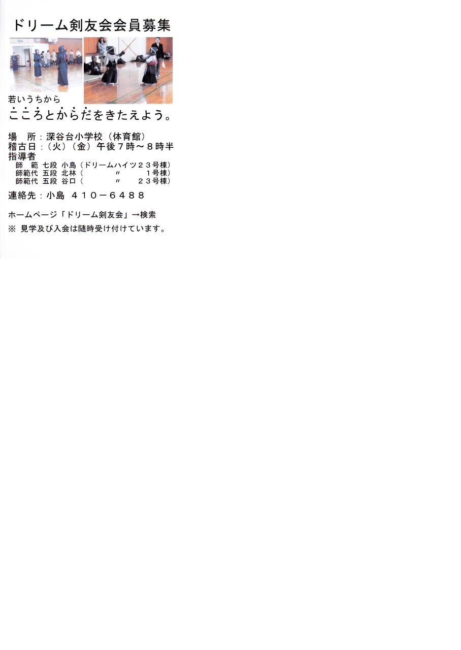 会員各位明けましておめでとうございます。 この度、ドリーム剣友会の一層の発展を図るため、平成25年1月からドリームハイツの23号棟711号室河原方に会長・師範の事務拠点となる出張所を設けることにしました。(ホームページの作成、剣道予定表の作成、会員募集など)住所:〒245-0066 横浜市戸塚区俣野町1403ドリームハイツ23-711河原方電話:省略(携帯(変わらず):省略)Eメール:(省略)(携帯:省略)(いずれも変わらず)25/1/2(水)21:00 ドリーム剣友会 小島甲子治
