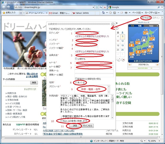 ⑦ 「ドリームハイツの歩き方」からあなたのeメールアドレス(下図6、7に記入したアドレス)宛てに、あなたが申し込んだことを確認するためのメールが届きます。(通常10分程度、翌日になってもメールが届かない場合は管理者までご連絡ください。)